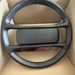 The product is a genuine OEM black leather steering wheel for a 1986 Porsche 930. Made in Germany, this vintage part features horn controls and a classic finish, making it a high-quality and authentic accessory for your Porsche vehicle. This steering wheel is designed to provide a luxurious and authentic driving experience for enthusiasts of vintage Porsche models.
