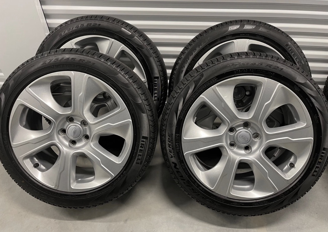 Authentic Range Rover Land Rover 21″ Wheels with All Season Pirelli Scorpion Verde All Season tires set. Wheels and tires were driven less than 100 miles since new. Tires are 275/45/21 and are in mint condition with 100% tread life Center Caps are included. There are no scratches or curb rash or damage. There has been no repairs or refurbishments done to these wheels and tires. I can also sell the wheels and tires separately.