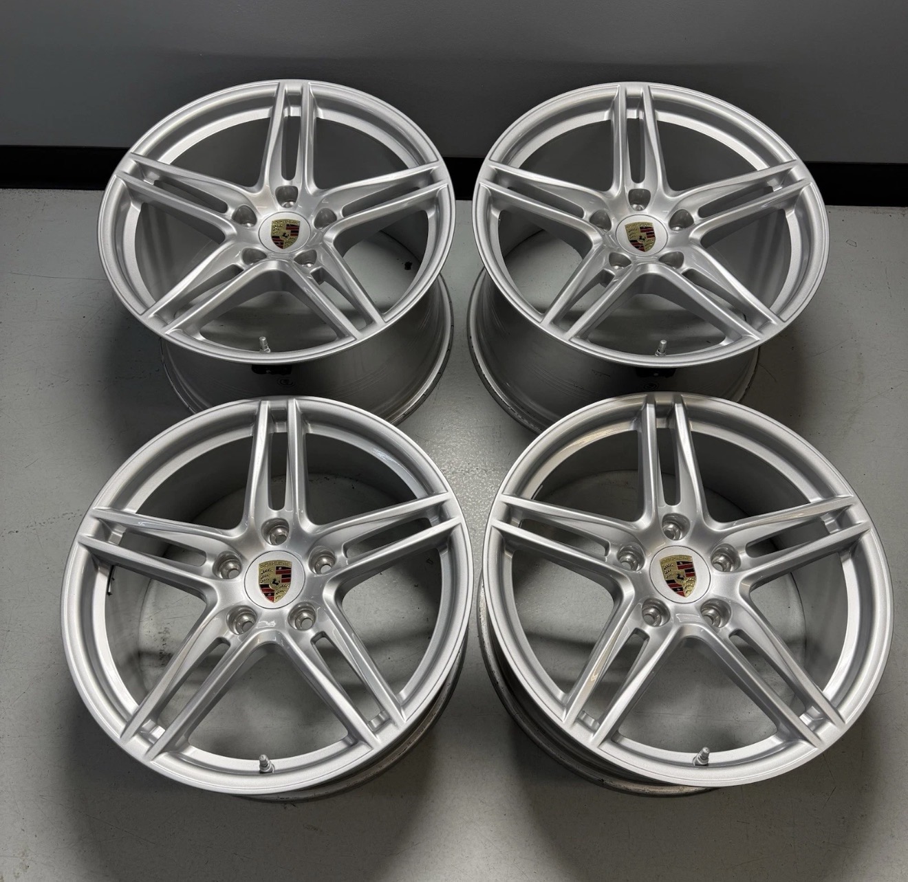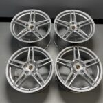 The product is a set of four OEM Porsche Carrera 911 991 19” wheel rims in silver color. These aluminum rims have a bolt pattern of 5×130 and a hub bore of 71.6mm. The front rims have an offset of 50mm and a width of 8.5 inches, while the rear rims have an offset of 56mm and a width of 11 inches. Included in the set are wheel center caps, TPMS sensors, and the manufacturer part numbers 991.362.560.03 and 991.362.510.00. Made in Italy, these rims come with a glossy finish and are designed for Porsche vehicles. All rims have been waxed for extra protection!